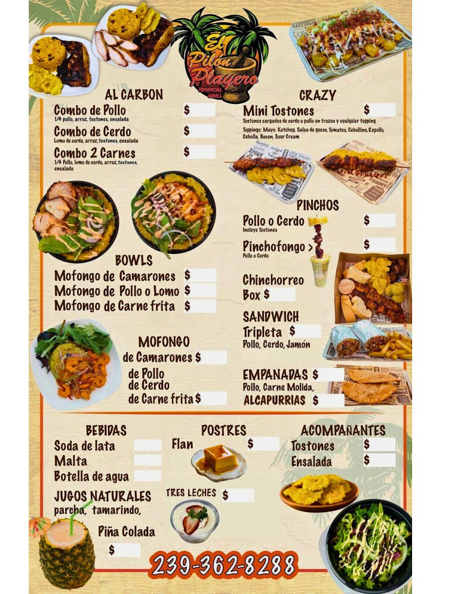 If you're in the mood for something authentic and bursting with flavor, the El Pilón Playero Menu is definitely worth checking out. Located at 4509 Lee Blvd in Lehigh Acres, FL, this place brings a vibrant mix of Caribbean and Latin-inspired dishes right to your plate. Whether you're craving a quick bite or a full meal, you'll find something to satisfy every taste. From savory seafood options to tender meats and fresh salads, there's something for everyone here. You can’t go wrong with their famous grilled fish or crispy fried plantains - perfect for sharing with friends or enjoying solo. And if you're in the mood for a refreshing drink, the menu features a great selection of tropical beverages to pair with your meal. Every dish is crafted with care, offering a true taste of the region, and you'll definitely leave with a full belly and a smile.